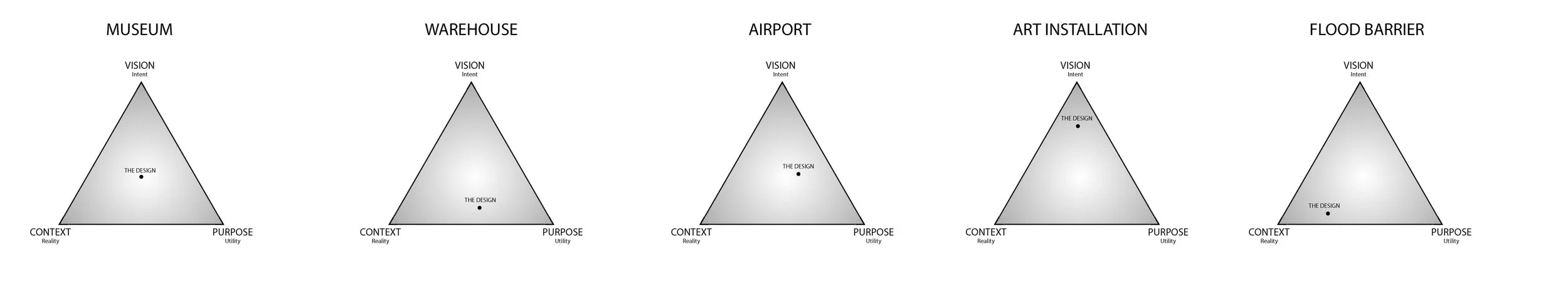 The dot positions above reflect an architectural perspective. Other disciplines would place them differently. A civil engineer designing an airport, for example, would likely pull the dot much closer to Context, where site conditions, ground engineering, and environmental constraints dominate. A branding consultant working on the same airport might shift the dot toward Vision. This is precisely the point: each discipline must define the triad for itself.