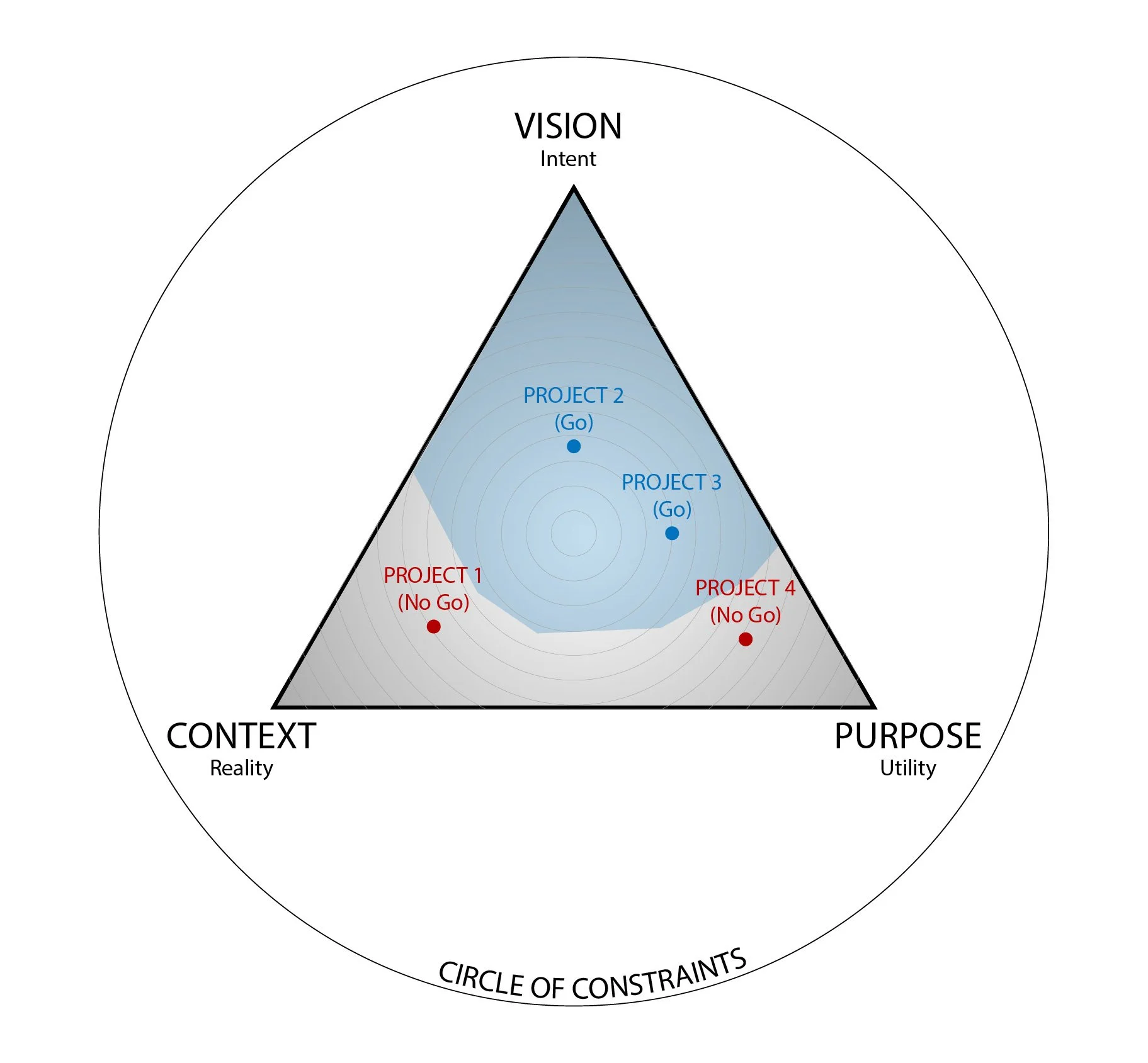 The triad is not just a theoretical model; it is a practical tool. One application is project selection. A practice can define its target zone within the triangle, the area where its expertise, values, and market positioning sit. Any incoming project can then be plotted as a dot. If the dot falls inside the target zone, it is a Go. If it falls outside, it is a No Go.